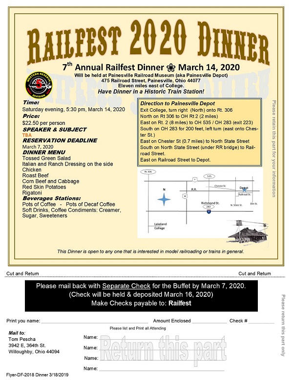 ![]() This year Div. 5 will be hosting a Railfest dinner at The Painesville Railroad Museum (aka Painesville Depot). Have dinner in a real train station! This will be a sit down family style dinner, all you can eat,. This event is open to anyone and everyone., not just dealers. The dinner menu is on the order form, but you must clip off the bottom of the form and mail it in with your payment.